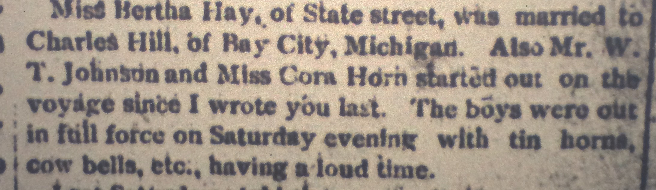 | Nov 16 1889 Bertha Hay _ Charles Hill marriage Saturday Sentinel |