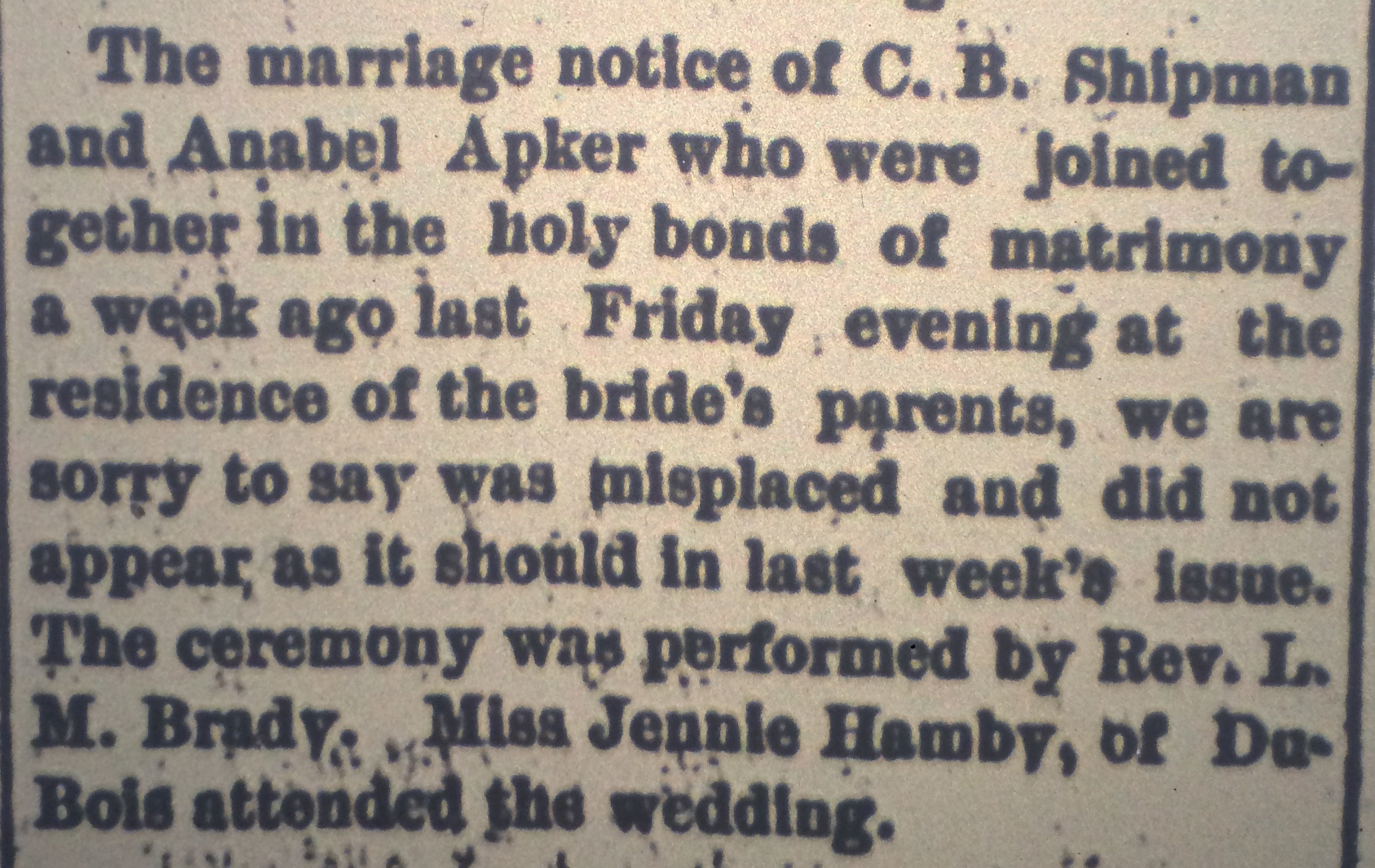 | Sep 14 1889 C.B. Shipman _ Anabel Apker marriage Saturday Sentinel |