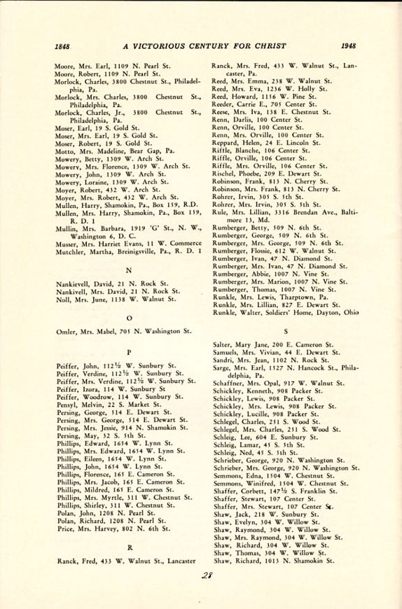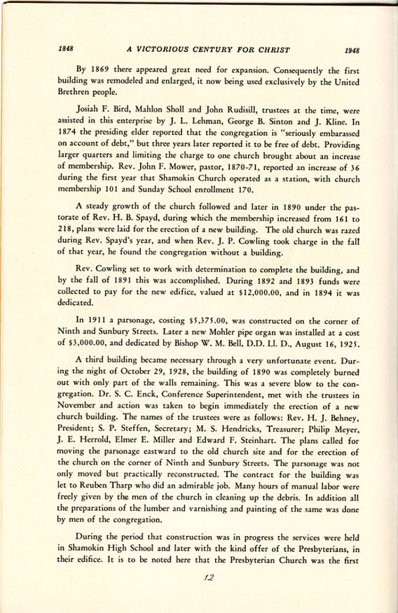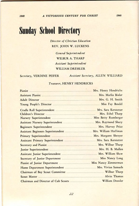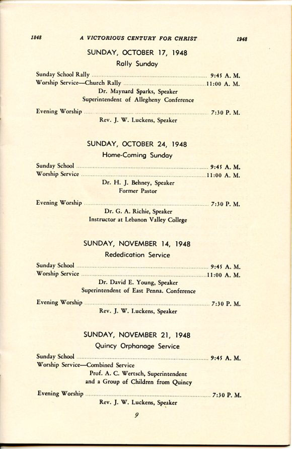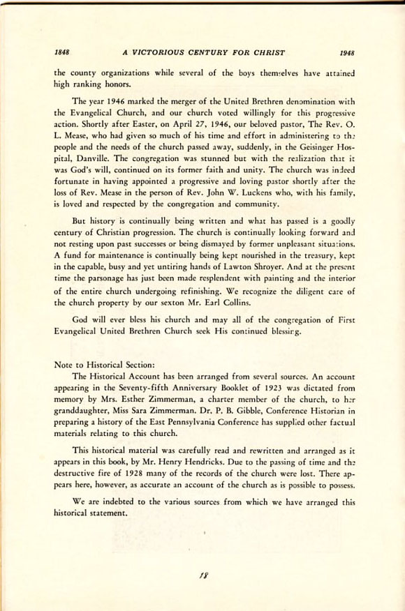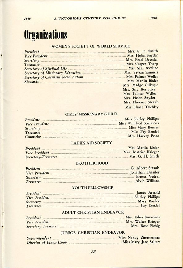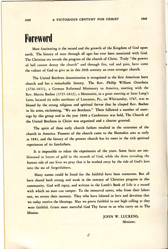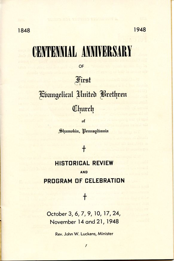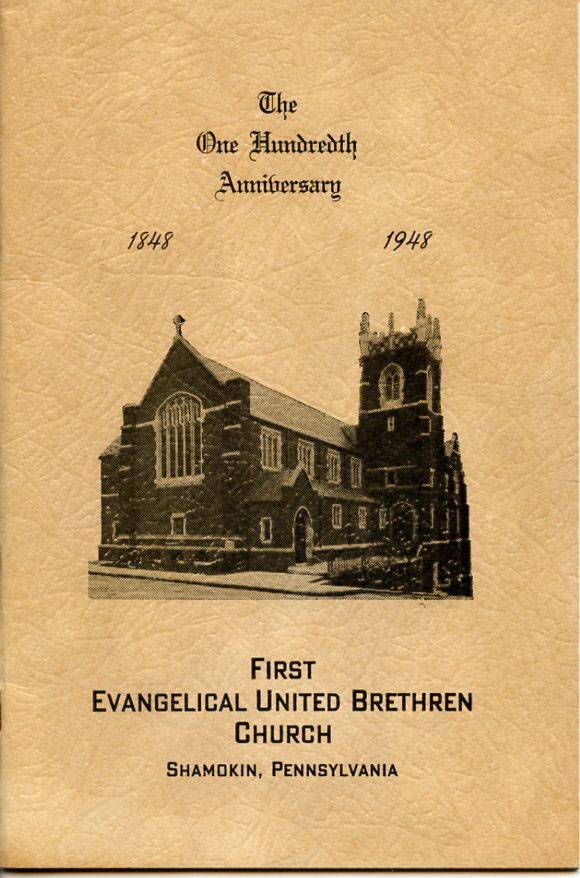 Pamphlet from the 100th Anniversary of the First Evangelical United Brethren Church, Shamokin Pennsylvania in 1948. -