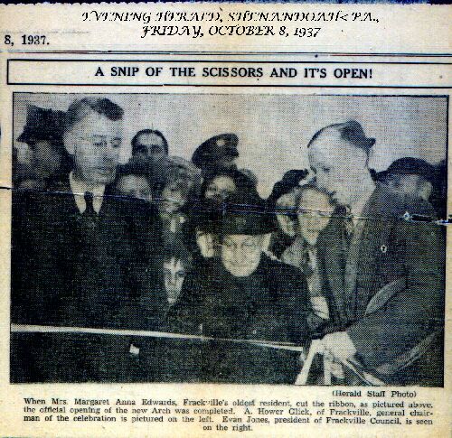 Caption reads: When Mrs. Margaret Anna Edwards, Frackville's oldest resident, cut the ribbon, as pictured above, the official opening of the new Arch was completed. A. Hower Glick, of Frackville, general chairman of the celebration is pictured on the left. Evan Jones, president of Frackville Council, is seen on the right.