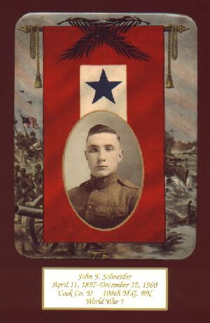 World War IIMay 2004 Marcia Ryon Walter Greenland RYON Enlisted in the US Army May 22,1917 at Pottsville. Served in France in the AEF from 6/1/1918 to 4/24/1919 with the 103rd engineers, 28th Div. He was in the Aisne Marne Defensive 7/14-7/27/1918, Adv on Oureg and Vesle Rivers 7/27-9/19/1918, Meuse Argonne Offensive 9/26-10/8/1918, Thiacourt Sector 10/15/1918-11/11/1918 and the Chateau Thiery Sector 6/28-7/12/1918. He was honarably discharged at Camp Dix, NJ May 19,1919. May 2002 Marcia Ryon S Edward "Ted" SAVAGE 3 kb April 2000 Lou Guerrieri John F. SCHNEIDER