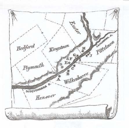E. Forty Fort;  F. Battleground; G. Wintermoot's Fort; H. Fort Jenkins;