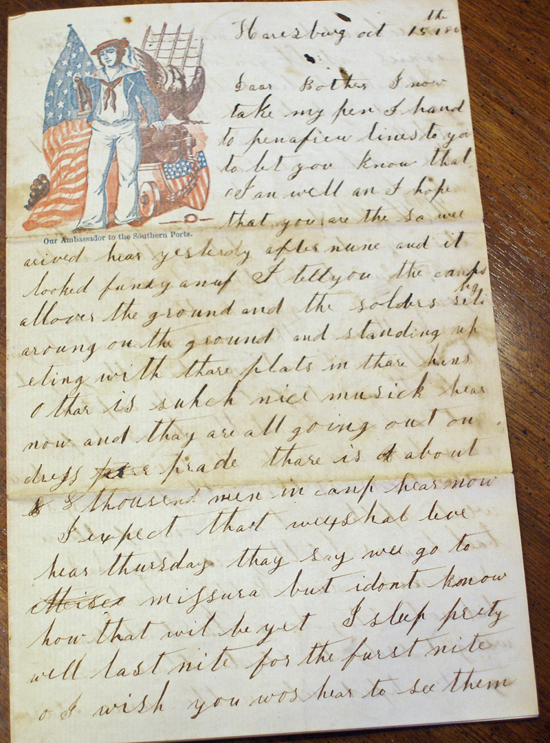 A letter from Savillion DaVall to his brother Charles O. DaVall Harrisburg, October 15th, 1861 Dear Brother, I now take my pen in hand to pen a few lines to you to let you know that I am well and I hope that you are the same. We arrived here yesterday afternoon and it looked funny enough, I tell you, the camps all over the ground and the soldiers sitting around on the ground and standing up eating with their plates in their hands. Oh, there is such nice music here now and they are all going out on dress parade. There is about a thousand men in camp here now. I expect that we shall leave here Thursday. They say we'll go to Mijsura (Missouri) but I don't know how that will be yet. I slept pretty well last night for the first night. Oh, I wish you was here to see them march and hear the music. It sounds so nice. I tell you, it is a nice place here to train, the ground is level and hard as a rock. I tell you, it is a nice country around here and I seen some nice farms when I came down here. Well, I had a nice view of Scranton (?). It is a quite nice place. There is the most machinery there I have ever seen. You can't begin to think what works (machinery) there is nor I can't begin to tell you. I went in where they got coal. The worst of it was the captain got dead drunk and the boys had to carry him down to the tavern where we stayed. And then all of us boys went up there. It was one of them bad houses, I tell you. They had some nice music there but we did not stay long. Just before we got ready to start (leave) there was a girl stepped out in the room where we stood and then she stepped back and then one of the boys followed her. Then we came away and walked around a spell and then went to the tavern and went to bed. Around midnight we heard someone hollering and knocking at the door and I and George rushed and got up and let them in. It was two of our boys. They had been out with some girls. I had my likeness (picture) taken up to Scranton for Sally. I guess that I will send my clothes home and then I will send my likeness. Well, I must bring this to a close for I must write to mother and John. Write soon and tell all the news, so good-bye from your ever affectionate brother. Savillion F. DaVall to Charles O. DaVall Harrisburg, Camp Curtin Care of Captain Parker Oh, there is such nice music here now and they are all going out on dress parade. There is about a thousand men in camp here now. I expect that we shall leave here Thursday. They say we'll go to Mijsura (Missouri) but I don't know how that will be yet. I slept pretty well last night for the first night. Oh, I wish you was here to see them march and hear the music. It sounds so nice. From Savillion DaVall’s October 15, 1861 letter. Camp Curtain was in Harrisburg, Pennsylvania. It served as the largest Civil War training camp from 1861-1865. Nearly 300,000 Union troops passed through Harrisburg. This is a letter to Savillion DaVall from a George M. Goodsell Headquarters Regt. Camp Halls Hill 20th N.Y. Lesley October the 23, 1861 Savillion DaVall Dear Sir, I was quite surprised to hear you had enlisted and gone off. I do not see how your folks could spare you, they have so much to do but, Savillion, I cannot blame you for leaving home to go and take your countrys' part. Any young man that can stay at home these times, when their country is on the brink of ruin is not fit for to have any protection from any government unless their business or circumstances prevents their leaving home. Perhaps you will at first think it rather hard fare at first but you will soon get accustomed to the living. A person cannot expect to have the same convenience that a good home would afford us but we are in a good and just cause and the right side must win after a short time. It will be quite a while before you will be drilled ready to go into action unless they do with you as they have with us, a sent us right on in front of the main army, ready or not, but we all improve very fast. How I wish you had come the same time we did. We would had good times, then we could mess together. We would have been in town then. We have been out on picket once since we have been here. Frank and I stood on the same post all the time we were out. We did not see any of the rebels but there was one of the 14th New York men that was shot while we were out. You must tell Charles Henry to write and let me know how the world uses him, if he finds it as he expected but you have not seen much of soldier's life yet. But we will all get into it before long. We expect to make another advance in a few days to Fairfax Courthouse. I suppose they will give us a very warm reception but we are ready for them. We can give to them as good as they send if not a little more so. John has been to see us once when we were on Moravian Heights. We had (a) first rate visit. It seemed like old times. I can tell you Frank and I tried to get a pass to go over and see John the other day. We went to the Capt(ain). He said he could not get one for himself, much more for us. We then went to the Colonel and asked him for one. He said we could have one but when we got one from the Capt(ain), the Colonel would not sign it with the Capt(ain) Shesefred (?), that our friends were sick. So we got cheated out of going. It seems hard when we are so nigh to our friends that we cannot go and see them but it would not do to have the men all going where they have a mind to. There would not be enough left to stand guard. It is almost roll call and I shall have to stop writing. The candle is almost burnt out. I need make no excuse for this poor writing for you know how it seems to write on a piece of board. So good-bye at present. Yours sincerely, from George H. Goodsell Write soon to Mr. Savillion DaVall, Esq. Letter from Savillion DaVall to his mother, Mary Jane DaVall Camp Welch, October 26th, 1861 Dear Mother, I now take this opportunity to pen a few lines to you to let you know that I am well and enjoying myself
